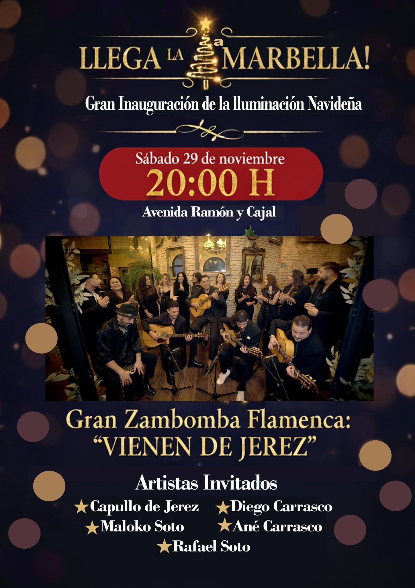 Este sábado 29 de noviembre, a las 20:00 h, la Avenida Ramón y Cajal se llenará de luz, arte y tradición con la Gran Inauguración de la Iluminación Navideña. El evento principal será la impresionante Zambomba Flamenca “VIENEN DE JEREZ”, un espectáculo único que traerá el auténtico duende jerezano a ...