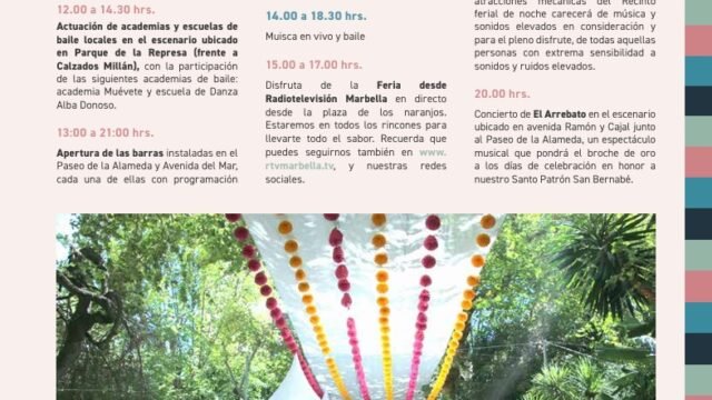 Detalles de Evento Este evento terminó el 15 junio 2025 Lugar de encuentro: Recinto Ferial Marbella Categorías: Espectáculos, Fiestas, Musica, Tradiciones 🎉 Feria y Fiestas de San Bernabé – Marbella 🕛 12:00 h.📍 Instalaciones deportivas de Arroyo Primero (Campo de fútbol Arroyo I)🌊 Fiesta Infantil del AguaGran jornada de diversión para los más pequeños con … Sigue leyendo Domingo, 15 de junio de 2025