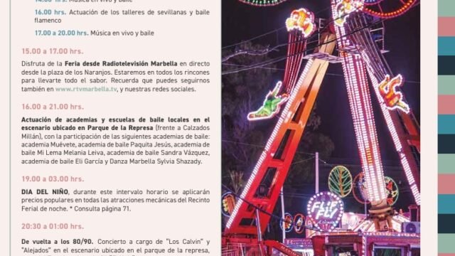 Detalles de Evento Este evento terminó el 12 junio 2025 Lugar de encuentro: Recinto Ferial Marbella Categorías: Espectáculos, Fiestas, Musica, Tradiciones 🎉 Feria y Fiestas de San Bernabé – Marbella (Continuación) 🕐 13:00 a 21:00 h.📍 Paseo de la Alameda y Avda. del MarApertura de las barras instaladas en ambas zonas, con programación propia para … Sigue leyendo Jueves, 12 de junio de 2025