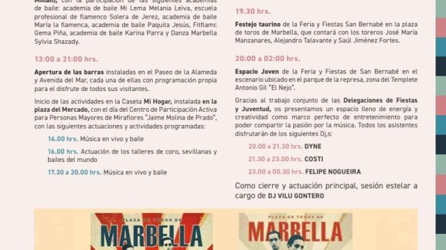 Detalles de Evento Este evento terminó el 14 junio 2025 Lugar de encuentro: Recinto Ferial Marbella Categorías: Espectáculos, Fiestas, Musica, Tradiciones 🎉 Feria y Fiestas de San Bernabé – Marbella 🕚 11:00 h.📍 Cruce de calle Salinas con calle Trinidad🏰 VI Recreación Histórica de la Entrada del Rey Fernando el Católico en Marbella (1485)Recorrido: c/ … Sigue leyendo Sábado, 14 de junio de 2025