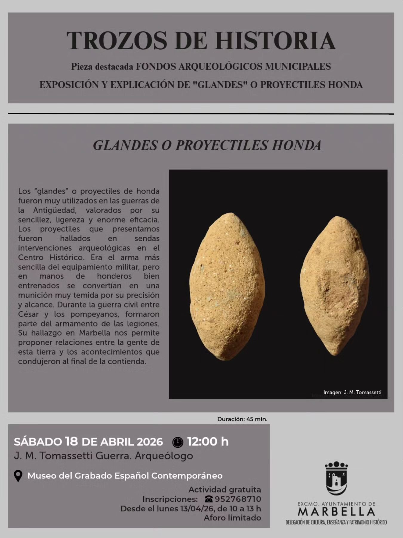 Bajo el título “Trozos de historia”, esta interesante actividad combina exposición y explicación sobre los llamados “glandes” o proyectiles de honda, a cargo del arqueólogo J. M. Tomassetti Guerra.